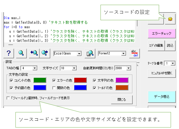 ① ソースコードで、検索したい文字列を選択状態にし、「検索文字の取得」をクリックすると、「検索文字」に入ります。(Ctrl+Fでも可能)