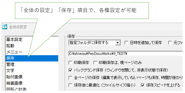 編集が終わったら、文書を保存します。 保存ダイアログの詳細は、下記の通りです。 PCWファイルでの保存 「ユーザー権限(PCWファイル)」をご確認ください。 保存の設定 「全体の設定」「保存」項目で、保存に関する様々な設定が可能です。 ※ 詳細は、こちら 上書き保存