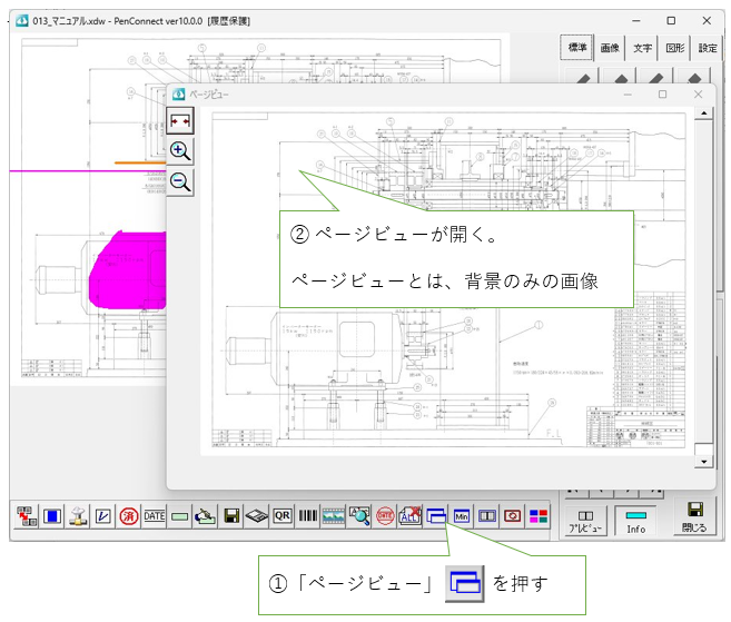 ページに関連するサブメニューは、以下の通りです。 ページ更新 ページ更新することで、保存の際は、強制的に全ページを保存しなおします。 ページ更新していない状態だと、表示したページのみが保存され、表示されていないページは、元のままとされます。 ページ回転 ページ履歴 5ページから、9ページに移動していた時、これを押すと、5ページに戻ります。 ページ分割 ページ一覧 ページビュー