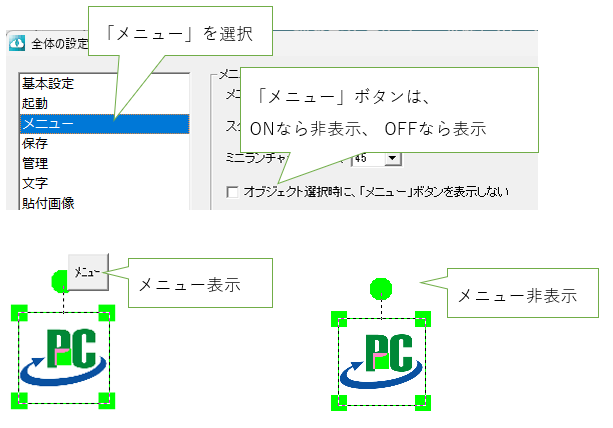 以下のように、「全体の設定」で、メニューボタンのON/OFFができます。