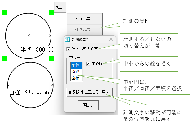 選択メニューの中にある「計測の属性」をクリックすると、計測状態のON/OFFと、中心円の属性設定が可能になります。
