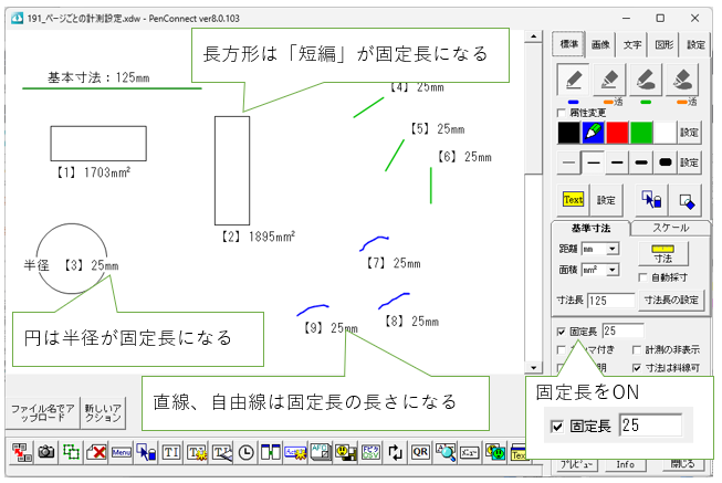 固定長をONにすると、設定された値で中心円の半径、長方形の矩形、直線と自由線の長さが、固定長で設定した長さになります。