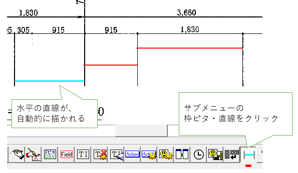 サブメニューで「枠ピタ・直線」を選び、画面上でマウスをホバーすると、自動的に水平の直線が描かれます。