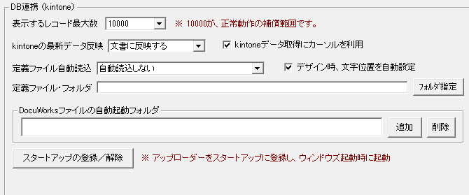 kintoneフィールドが設定されたDocuWorksファイルを開いたとき、kintone側のデータを確認し、データが更新されていた場合、文書に自動的にデータを「反映するか、しないか」を設定します。