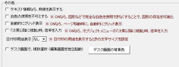 設定のイメージは、下記の通りです。 テキスト情報なら、枠線を表示する ONにしたうえで、テキスト情報(TI)の内容を変更すると、枠線がつきます。 白色の使用を不可とする 自動的にグリッド表示 「次頁以降に複製」時、倍率を入力 日付印用途表示 権限設定している場合に、日付印の用途を表示することができます。 デスク画面で、複数選択 (編集画面を独立起動) デスク画面の背景色