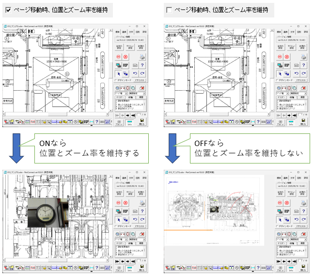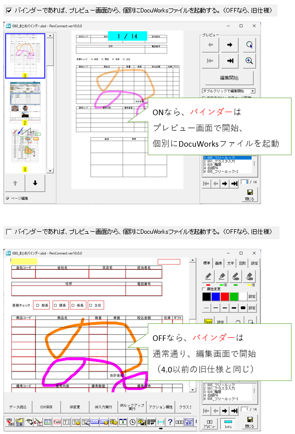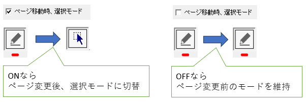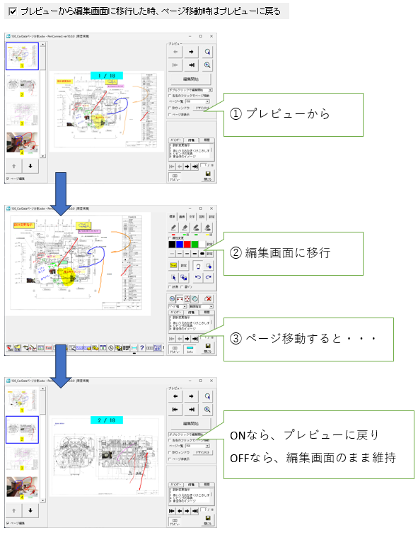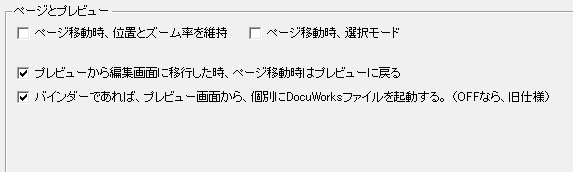 設定のイメージは、下記の通りです。 ページ移動時の位置とズーム率の維持 ページ移動時、選択モード ONなら、ページ移動時に、選択モードに設定される プレビューから編集画面に移行した時、ページ移動時はプレビューに戻る バインダーであれば、プレビュー画面から、個別にDocuWorksファイルを起動する