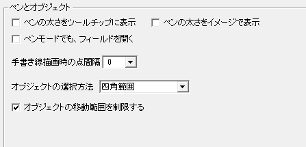 設定のイメージは、下記の通りです。 ペンの太さをツールチップに表示 ペンの太さをイメージで表示 ペンモードでも、フィールドを開く 手書き線描画時の点間隔 点間隔を設定すると、ジャギー(ギザギザ)が目立たなくなり、滑らかな線になります。 オブジェクトの選択方法 「四角範囲」または「投げ縄」を選択できます。 オブジェクトの移動範囲を制限する