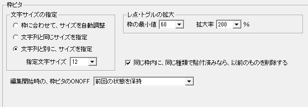 設定のイメージは、下記の通りです。 枠ピタ、文字サイズの指定 枠ピタ、文字サイズの設定です。 編集開始時の、枠ピタON/OFF 起動時における、枠ピタ状態を設定します。 レ点・トグルの拡大 レ点トグルの時に、枠をはみ出して「レ」を表示するか、設定します。 同じ枠内に、同じ種類で貼付け済みなら、以前のものを削除する ONなら、既に貼り付けられたトグルを削除して、新しいトグルを貼り付けます。