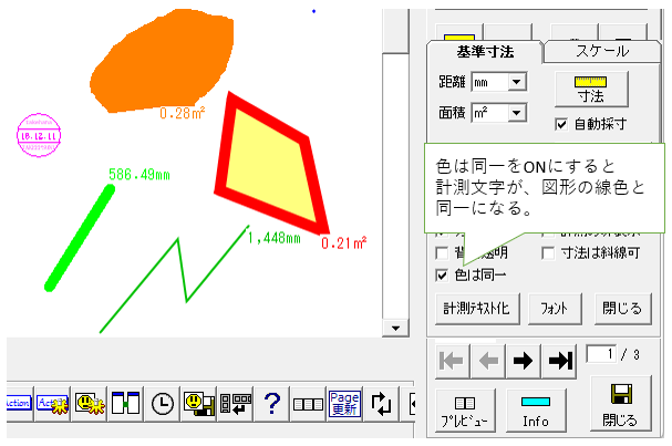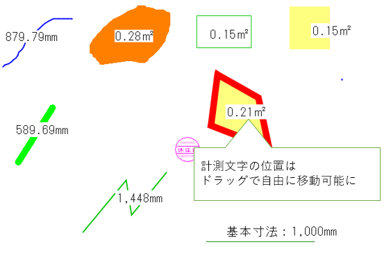 | 計測文字の移動、色変更 | 計測文字の移動ができる、線の色と同一にする |