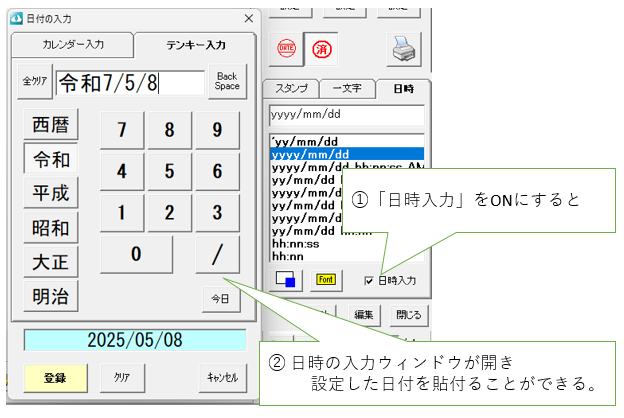 日時スタンプを貼り付ける前に、日時を入力できる。