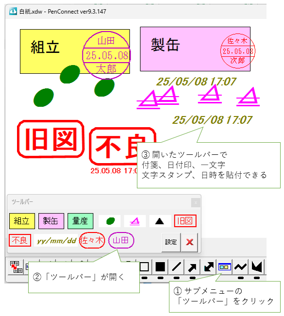 | ツールバー | 付箋、日付印、一文字、文字スタンプ、日時が扱えるツールバー |