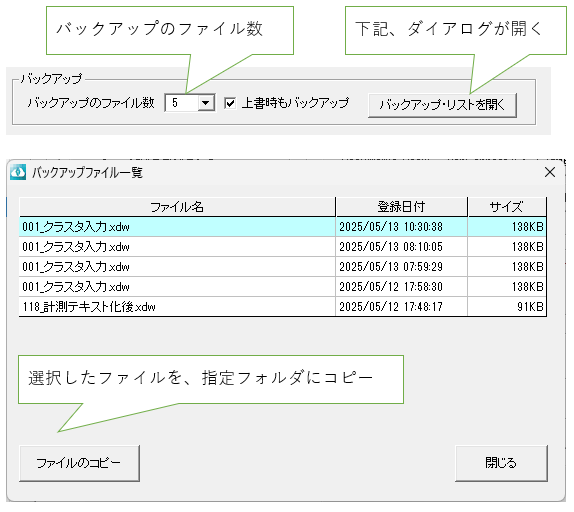 | ファイルのバックアップ | DocuWorksファイルを開く前に、バックアップを保存する。 |