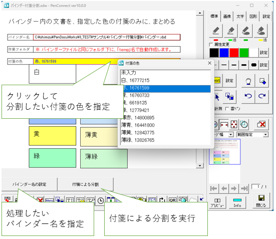 バインダー内の文書を、指定した色の付箋のみにまとめます。 ※ 詳細は、こちら