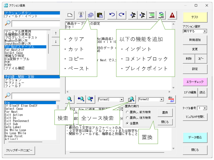 検索・置換、インデント、コメントブロック、ブレイクポイントなどの機能を追加。 ※詳細はこちら