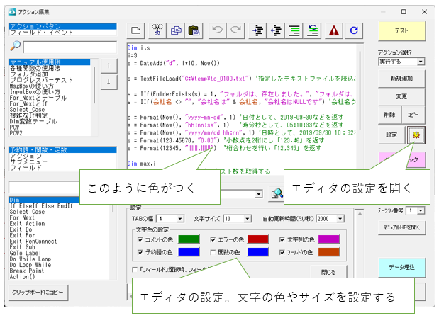 | アクション編集エディタの色付け | アクション編集画面のソースエディタを色付けする |