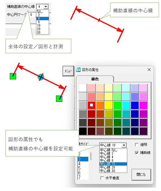 全体の設定で、図形と計測を選び、その中にある補助直線の中心線を設定します。
