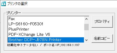 | 引数 | PrintName:印刷するプリンタ名。(初期値は、通常のプリンタ) StartPage:開始ページ。(初期値は、1) EndPage :終了ページ。(初期値は、最後ページ) TateYoko :0=縦、1=横。(初期値は、0) CopyCnt :部数(初期値は、1) ※ プリンタ名は、PenConnectの印刷ダイアログの「名前コピー」ボタンを押すと、クリップボードにコピーされます。 ![]() |
