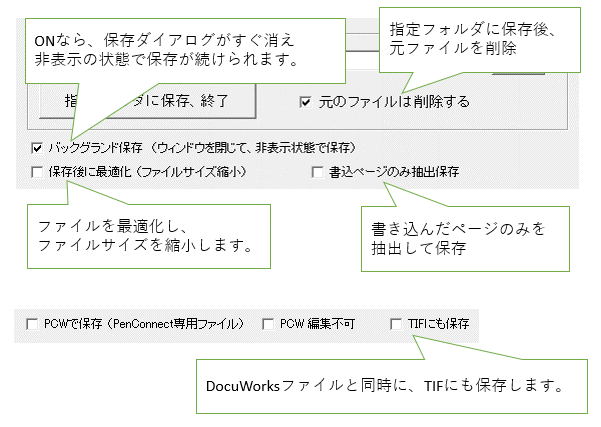 編集が終わったら、文書を保存します。 保存ダイアログの詳細は、下記の通りです。 PCWファイルでの保存 「ユーザー権限(PCWファイル)」をご確認ください。 保存の設定 「全体の設定」「保存」項目で、保存に関する様々な設定が可能です。 ※ 詳細は、こちら 上書き保存