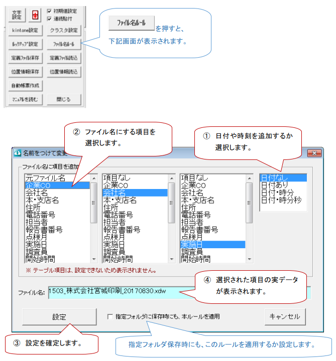 ファイル保存時、ファイル名を一定のルールを設定し、自動変更することができます。