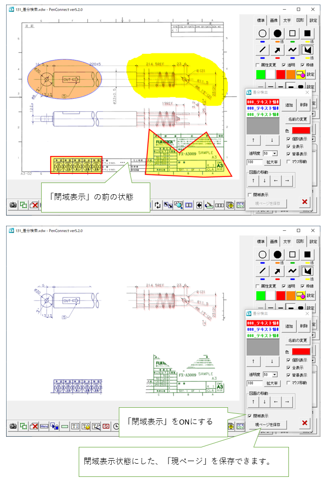 ※ ver5.2以降の機能です。 他の図面や文書に、色を付けて重ね、その違い(差分)を検出することができます。 以下は、実際に差分検出したイメージです。 動画マニュアルを見る 差分検出を行うには、次のようにします。 差分の「追加」は、次のように行います。 差分合成 複数の差分を合成し、1つの差分にすることができます。 閉域表示 囲みペン、円、四角、多角形で囲んだ領域(閉域)のみを表示することが可能です。