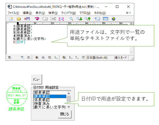用途一覧のテキストファイルで、日付印を貼り付けた時に、その用途を設定できます。