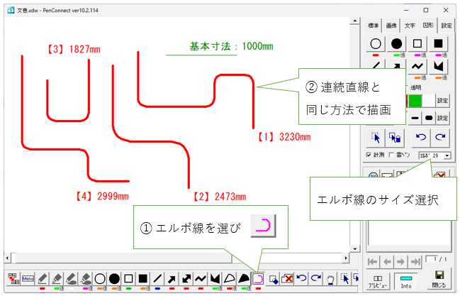 連続直線の角を丸くした線、「エルボ線」を描画します。計測も可能です。(詳細はこちら)