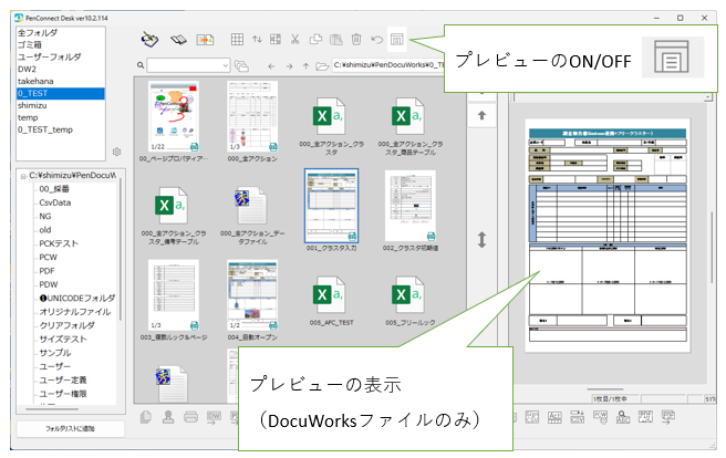 PenConnect Deskに、プレビュー表示します。ただし、DocuWorksファイルのみが表示対象です。